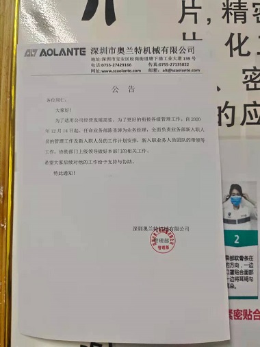 深圳市奧蘭特機(jī)械有限公司人事變動(dòng)